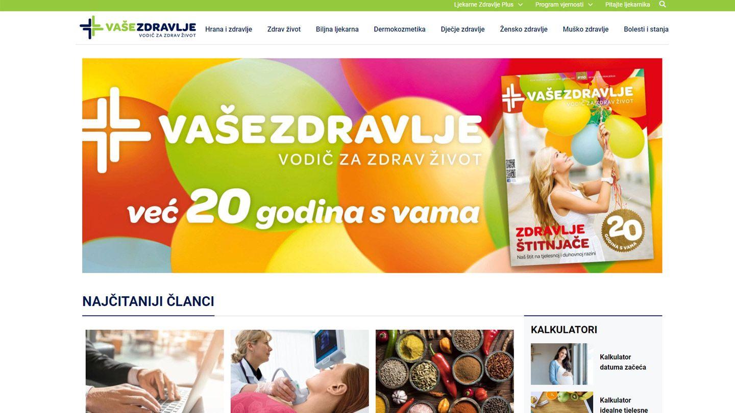 Novi portal Vaše zdravlje je lansiran u listopadu. Primjetna razlika u odnosu na dosadašnji portal svakako je moderan i pročišćen vizualni prikaz uz novu kategorizaciju stručnog sadržaja koju prati sinergija s pogodnostima programa vjernosti Zdravlje Plus – online pristupnice programu vjernosti, lokatora Zdravlje Plus ljekarni, mogućnosti provjere stanja bodova na kartici i pregleda mjesečnih popusta u odabranim ljekarnama.