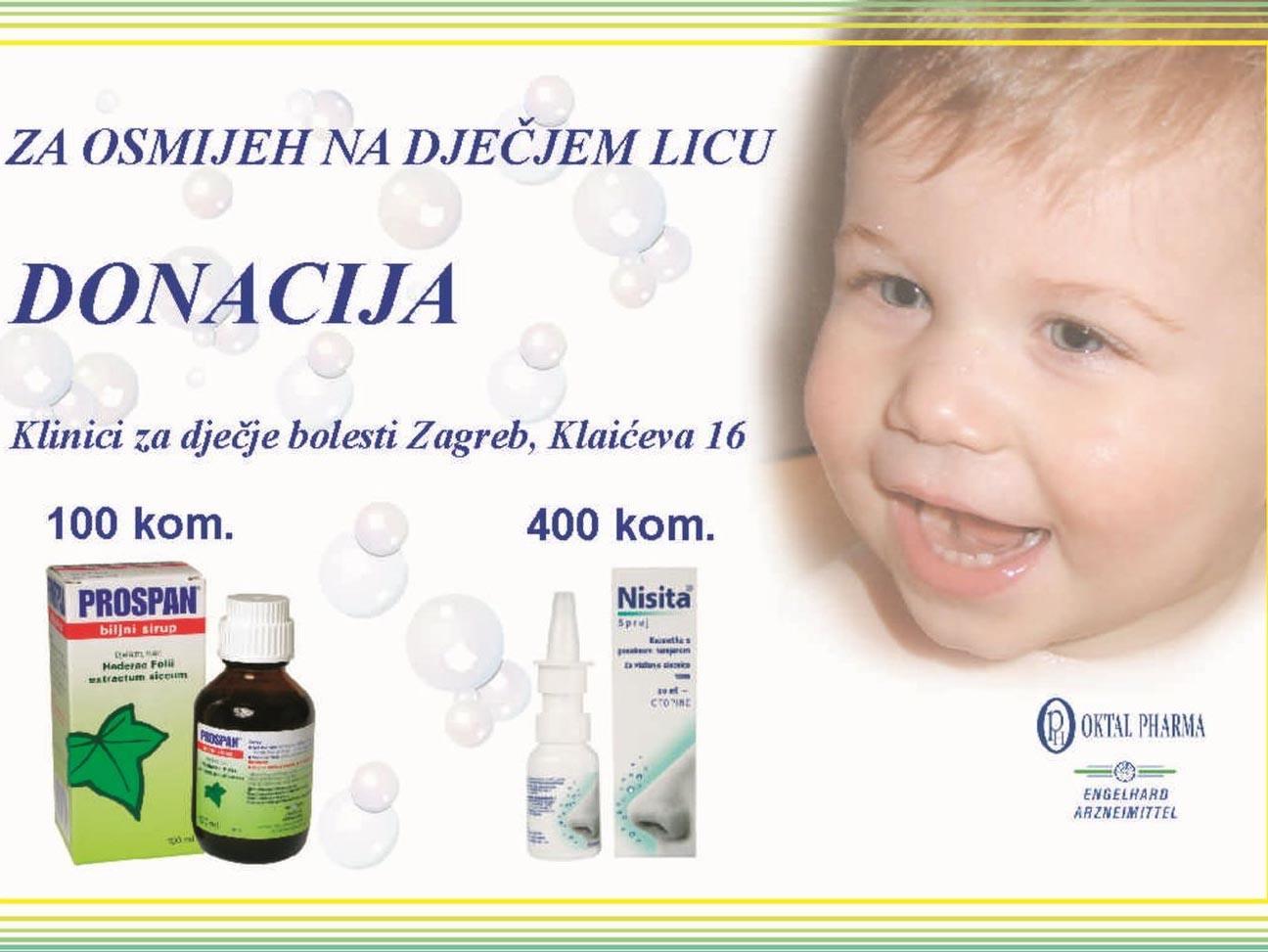 Oktal Pharma u suradnji s poslovnim partnerom Engelhard Arzneimittel iz Njemačke, 28. ožujka 2007. je Klinici za dječje bolesti Zagreb donirala proizvode iz zastupničkog asortimana tvrtke Engelhard – 100 komada Prospan biljnog sirupa protiv kašlja i 400 komada Nisita spreja za nos. Na ovaj način Oktal Pharma i tvrtka Engelhard poduprli su jedinstveno geslo Klinike – “Sve za dijete pod jednim krovom”